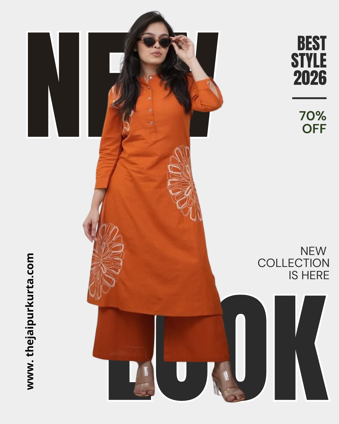 Orange Pure Cotton Kurta Pant Set with Embroidery Work